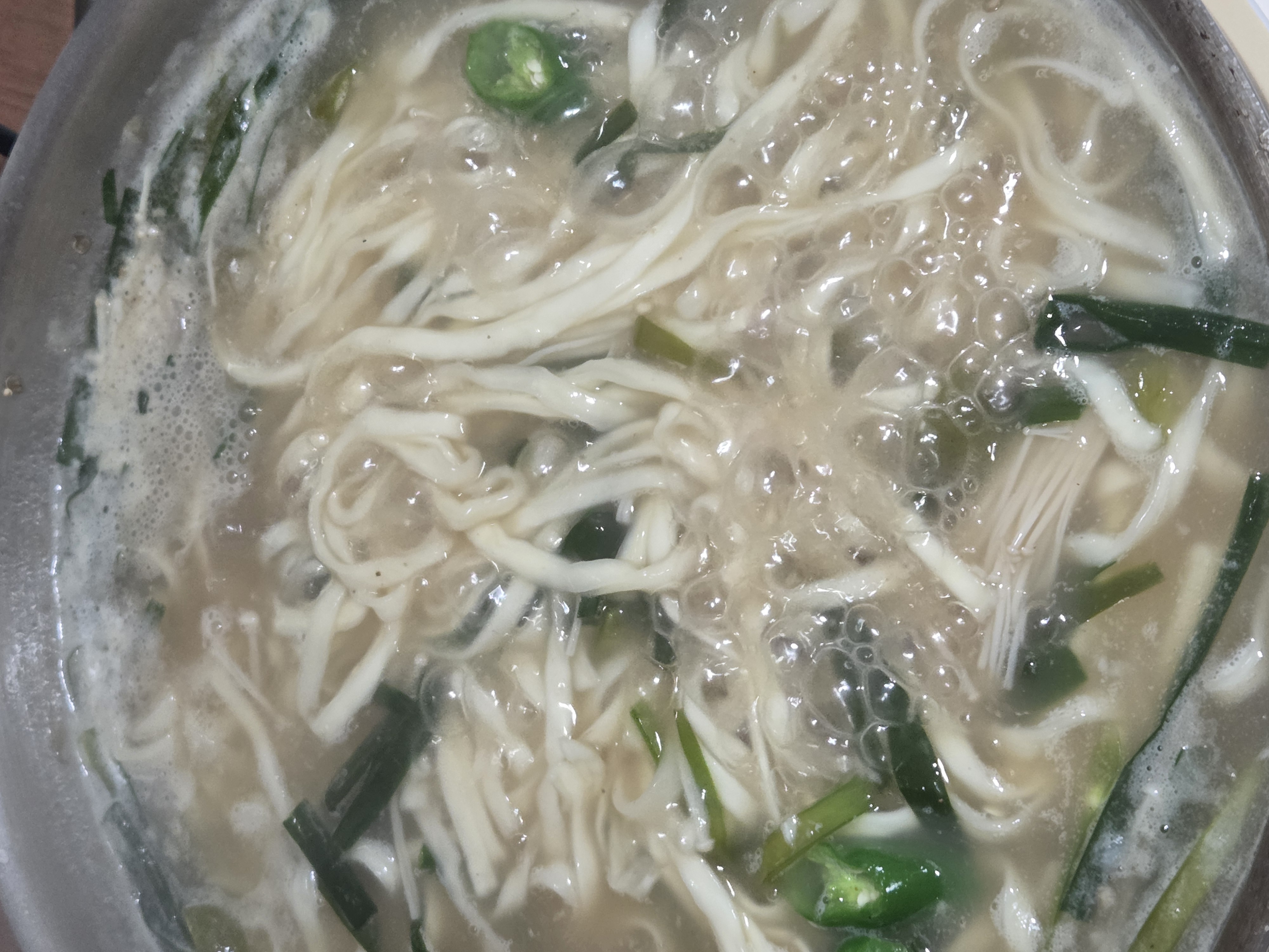 전골을 거의 다 먹고 난 후, 남은 국물에 칼국수 사리를 넣습니다.물.마늘.소금등 육수 추가하면 되구