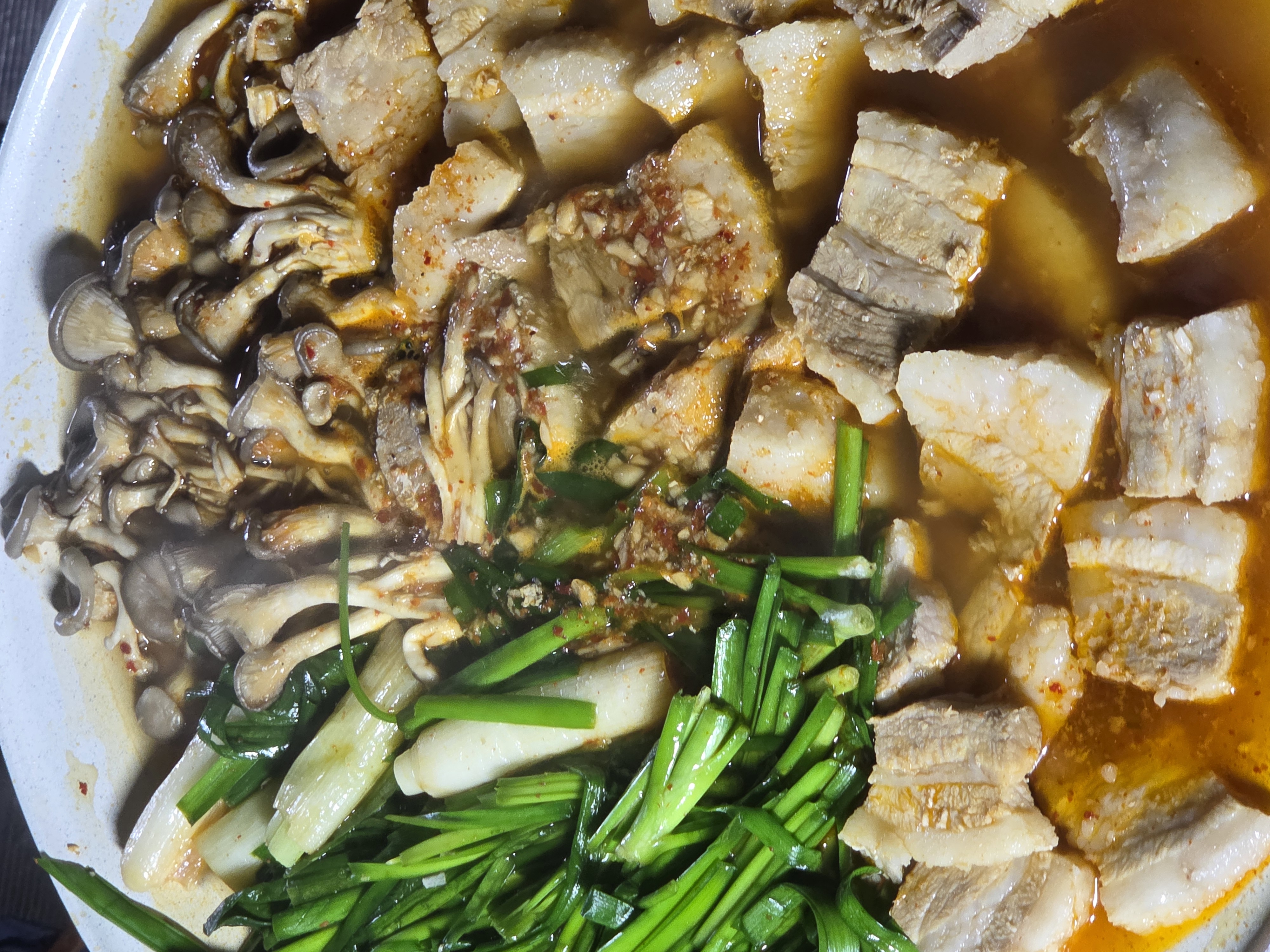 고기만 먹으면 느끼할 수 있기에 국물요리를 준비했어요. 버섯, 두부, 채소를 넣은 전골은 속을 든든하게 채워주고, 캠핑장의 선선한 밤공기와도 너무 잘 어울렸습니다. 따끈한 국물이 있어야 캠핑의 완성이라고 생각합니다.