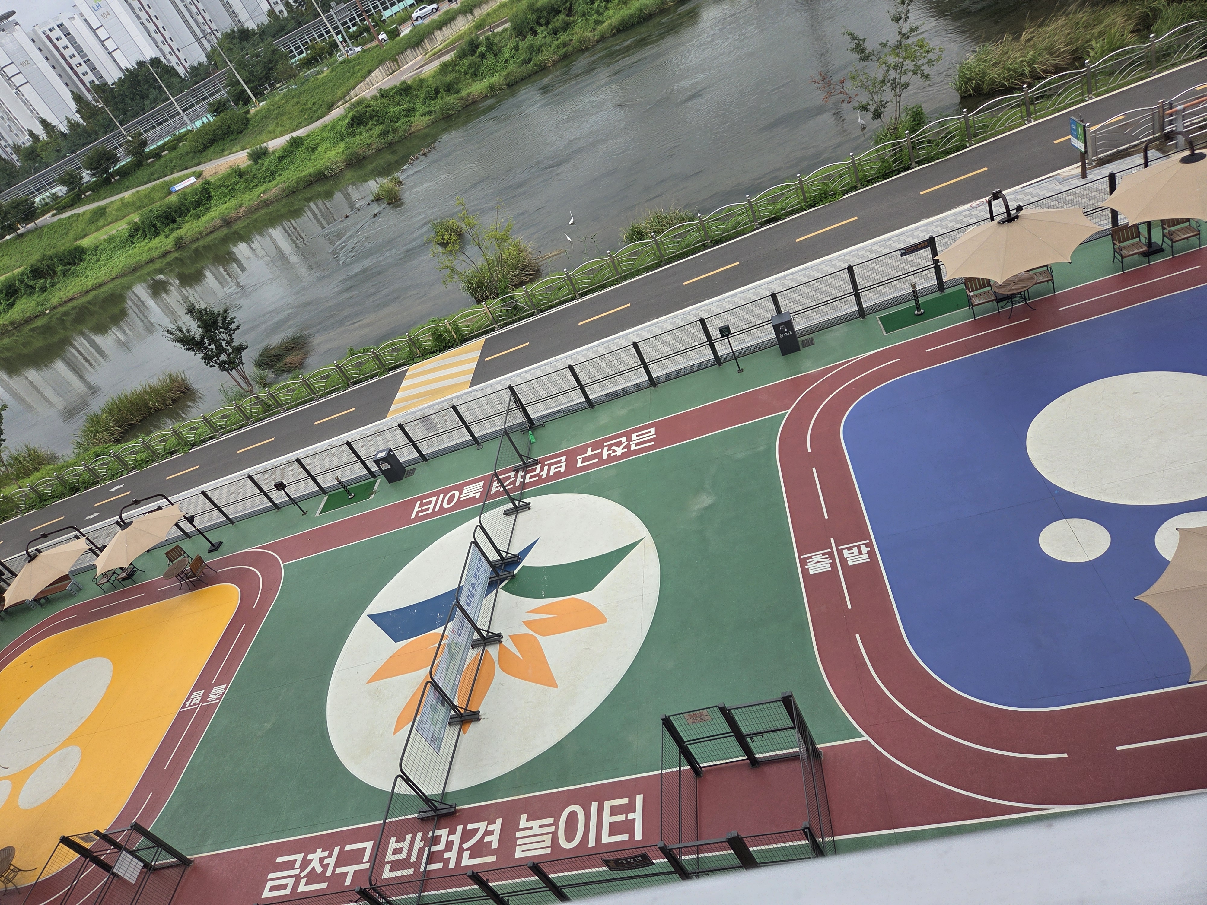 금천구 반려견 놀이터는 안양천 둔치, 시흥대교 하부에 자리해 있어서 찾기 쉬워요. 강아지 산책하다가 들르기 딱 좋은 위치라서 동네 주민분들이 자주 이용하실 것 같더라구요. 입구부터 깔끔하게 관리가 되어 있었고, 무엇보다 무료로 운영된다는 게 정말 반가웠어요.